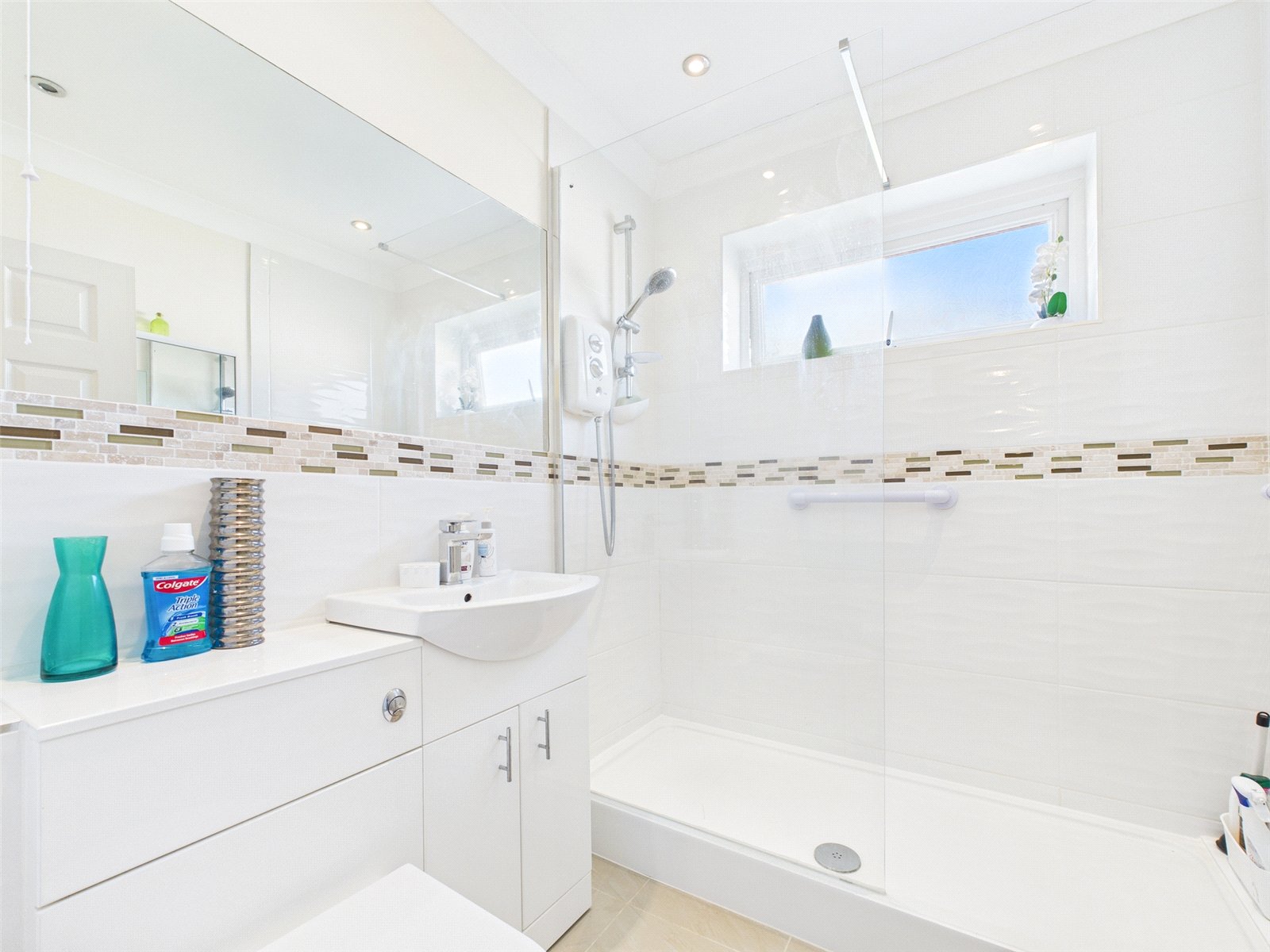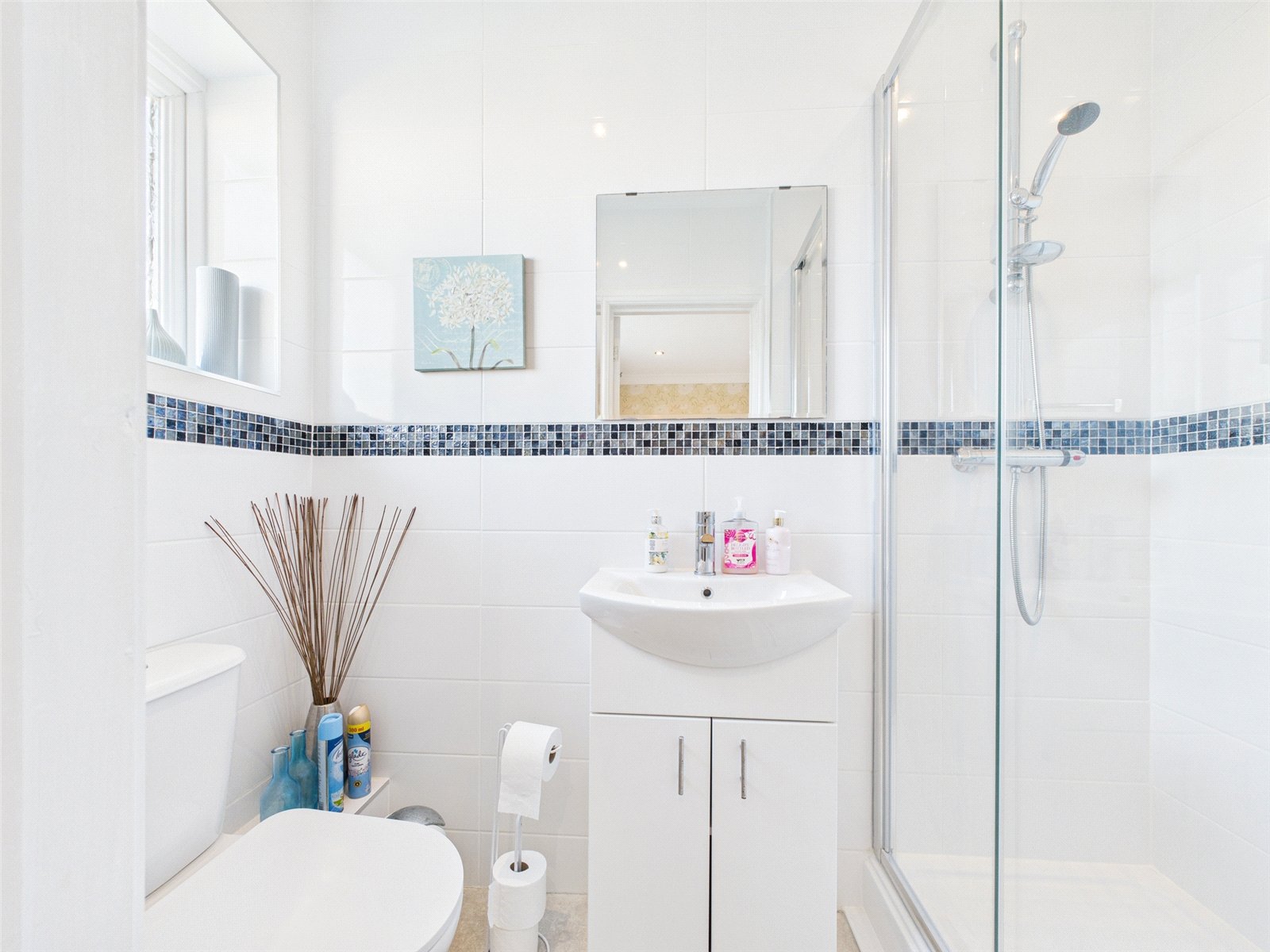 The main bathroom is fully tiled with a heated towel rail and a window, comprises a full width shower with fixed glass shower screen, and an inset wash hand basin and WC with storage cupboards.