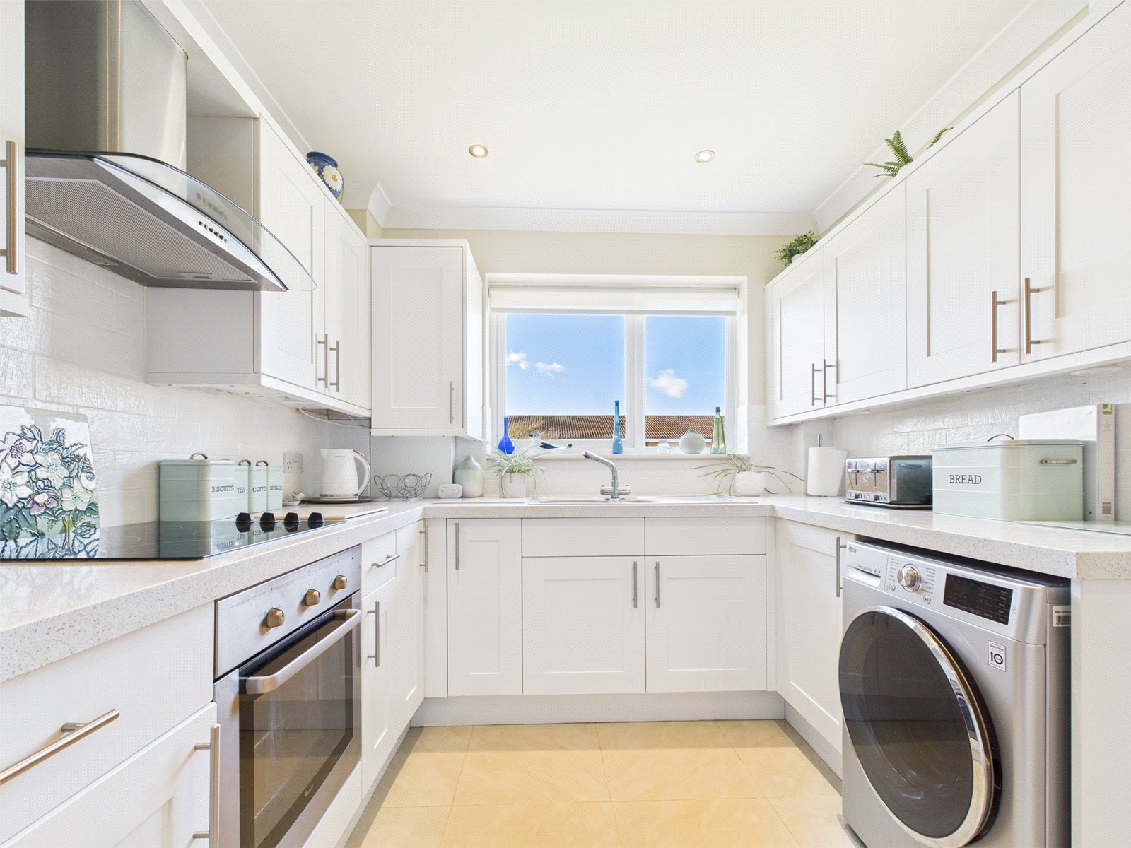 The modern kitchen comprises a range of eye and base level units with cupboards and drawers. Space for a washing machine and fridge freezer. Integrated oven with hob and a modern combi gas boiler.