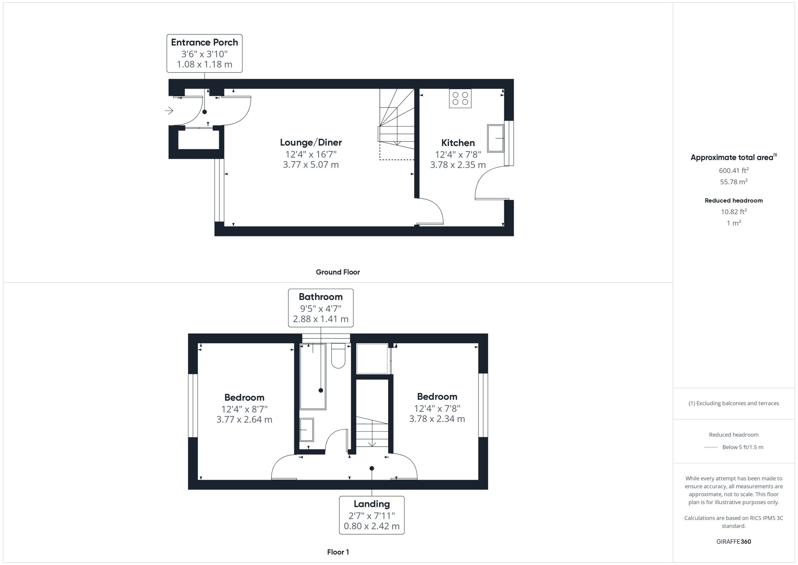 Stairs from the lounge/diner lead to the first floor landing. There are two double bedrooms which both have built in storage. There is a bathroom with wc, basin and bath with shower over.
