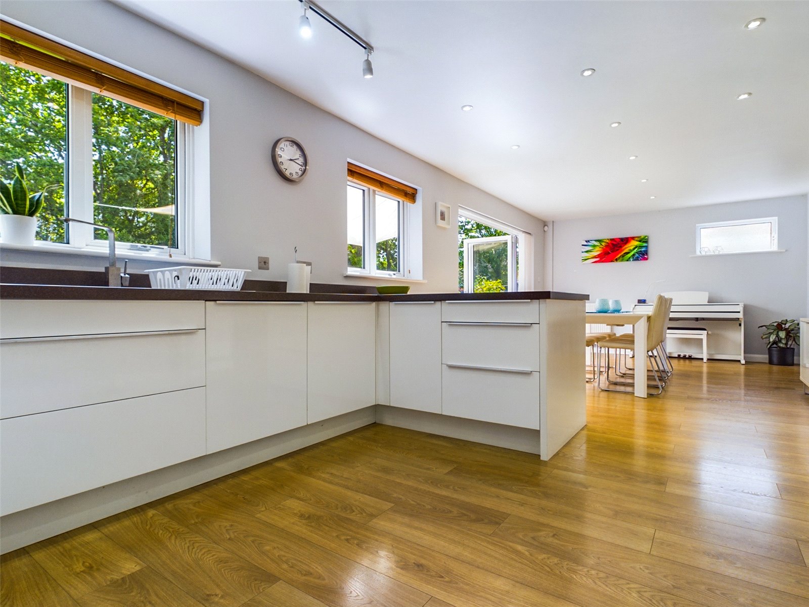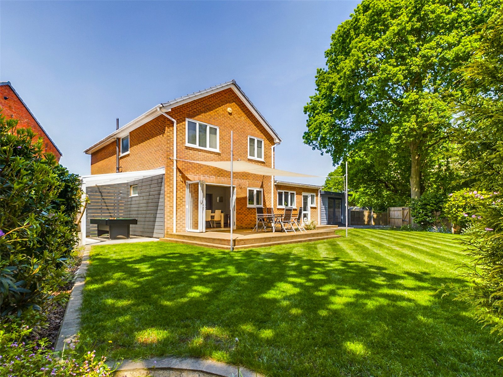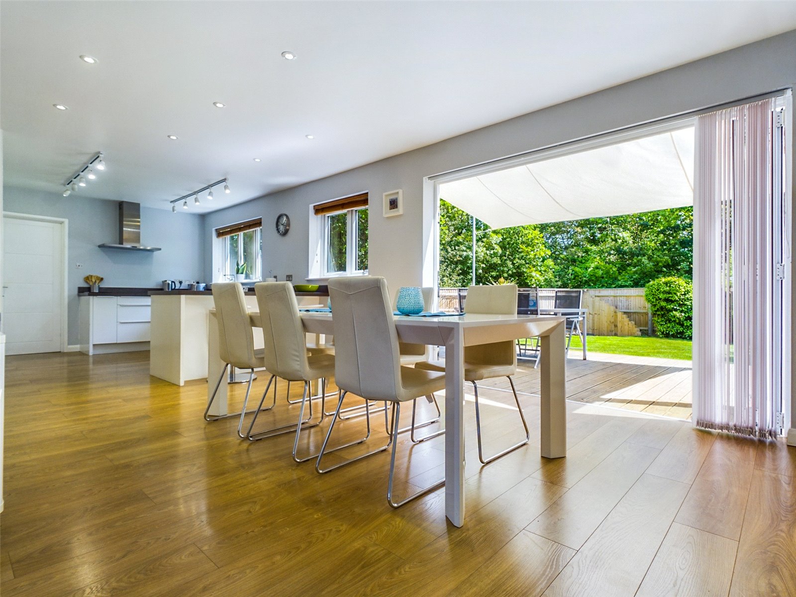 A good size living room has a front aspect window, and double doors that open into the kitchen diner which runs across the rear of the house. The kitchen has a range of modern white high gloss eye and base level units with cupboards and drawers. Integrated appliances with space for the free standing items in the separate utility room, where you can also access the integral double garage and garden. Bifold doors open form the dining area out on to a large decking.