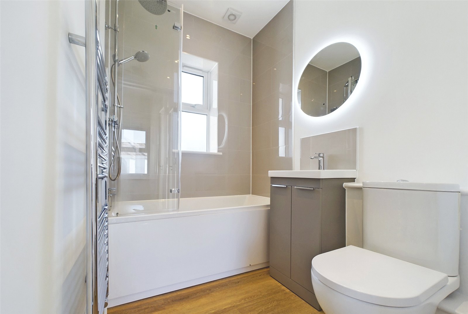 The bathroom has also been fitted to a high standard incorporating a low level wc, hand wash basin with vanity storage beneath, and a full sized bath with a shower over and shower screen to side.