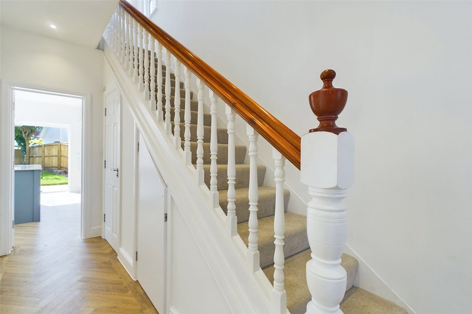 The kitchen has been superbly fitted and boasts a set of Bi-folding doors opening out to the rear garden. There is an extensive range of eye and base level storage cupboards, expansive stone working surfaces, and a great sized Island which offers further storage and room for several stools for casual dining and day to day living. Fitted appliances include an induction hob with extractor over, an eye level oven, integrated fridge/freezer and dishwasher. Space for a washing machine having been cleverly concealed beneath the stairs.
