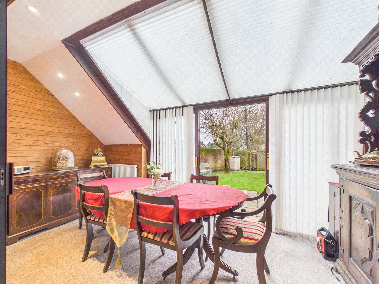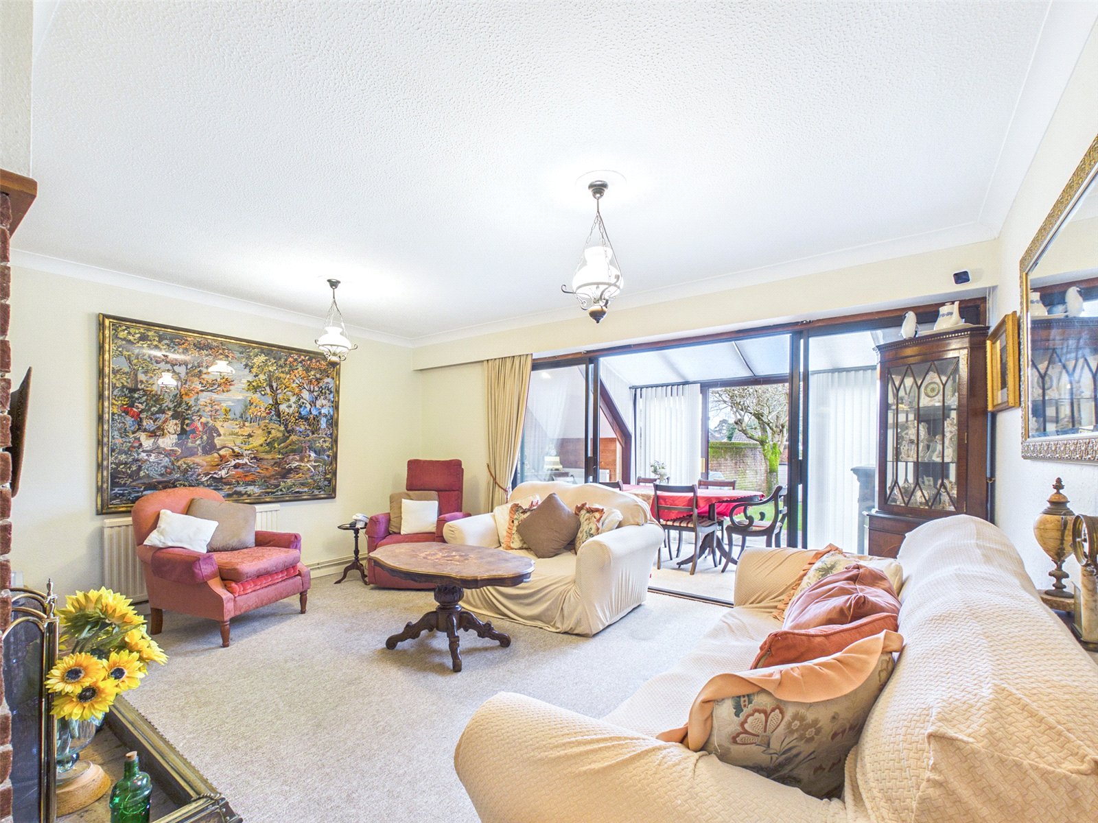 The Living Room features a red brick fireplace and sliding doors to the Dining Area which enjoy doors to the rear garden.