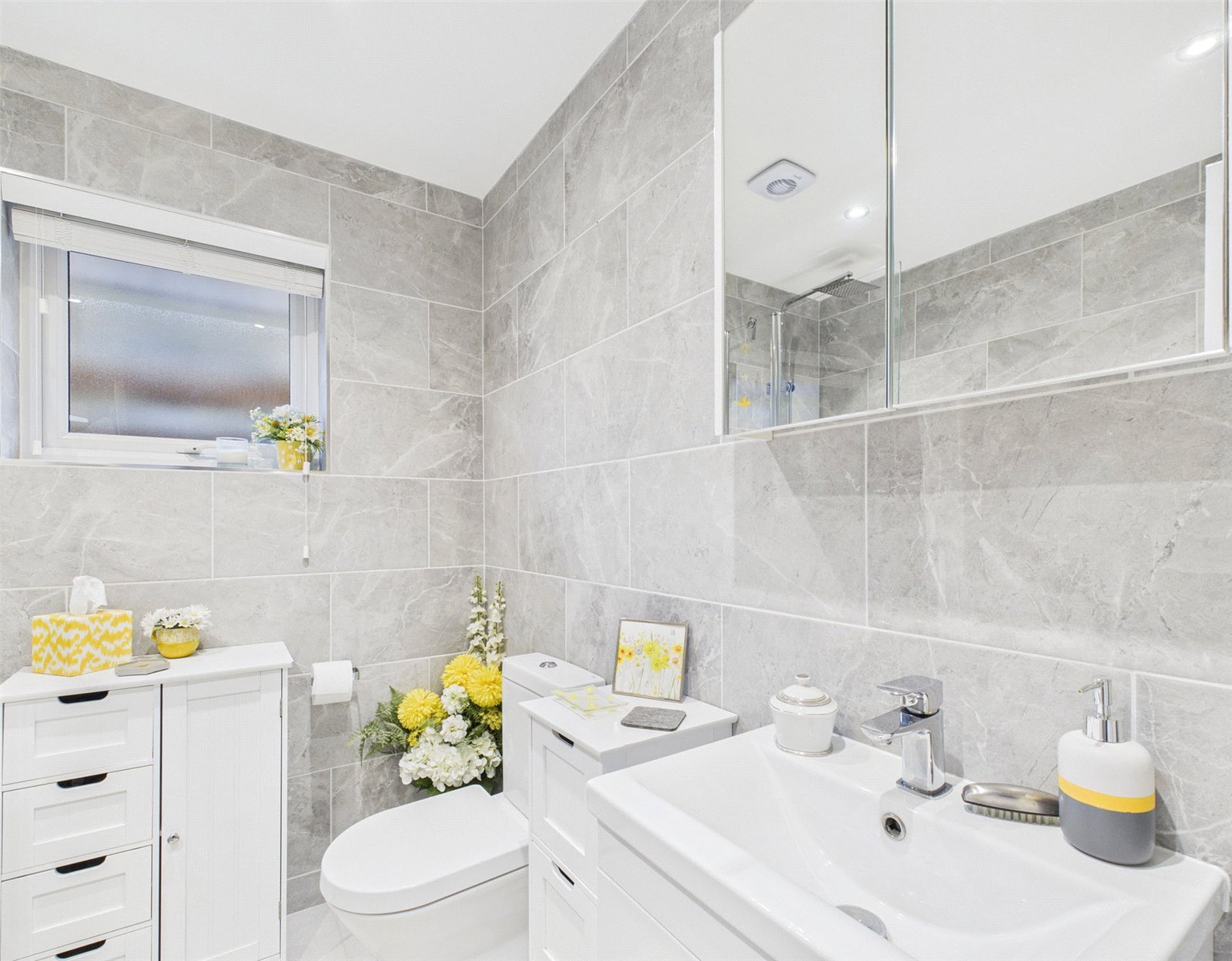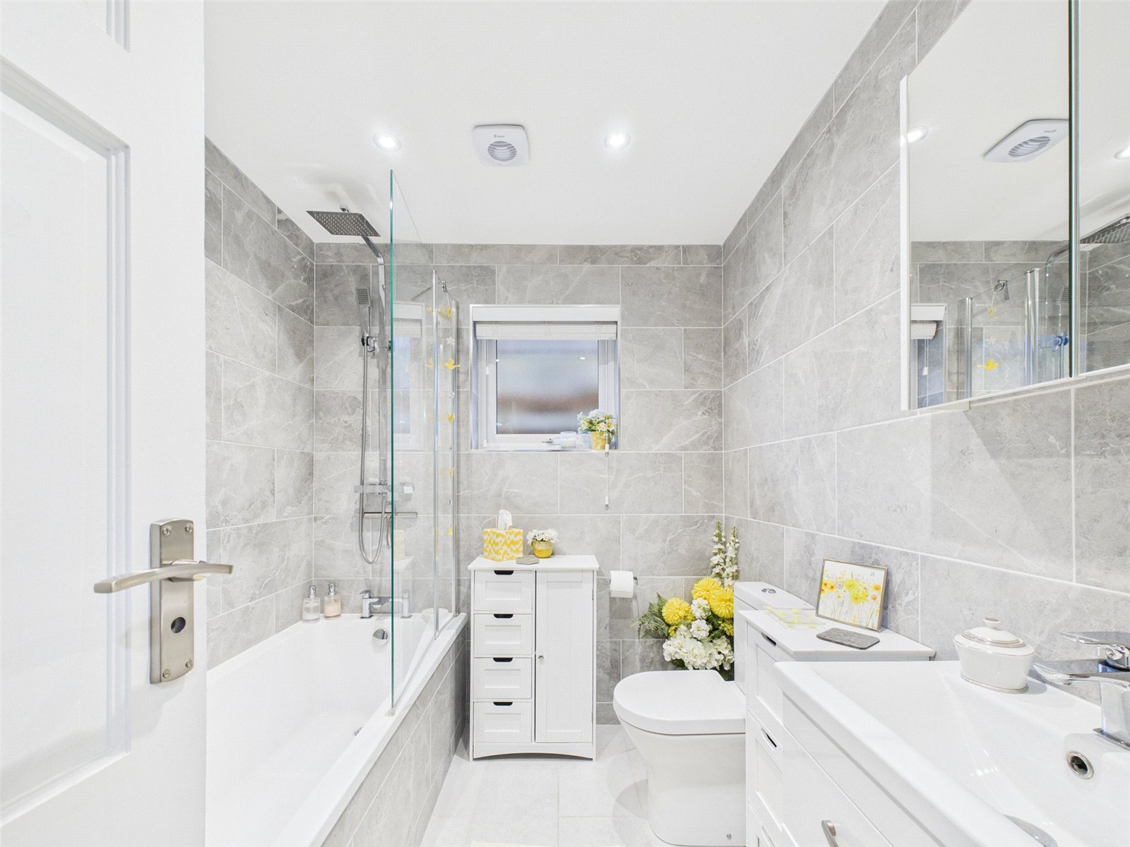 The fully tiled Bathroom offers a tasteful suite incorporating a bath with shower fitment over, further complemented by underfloor heating.