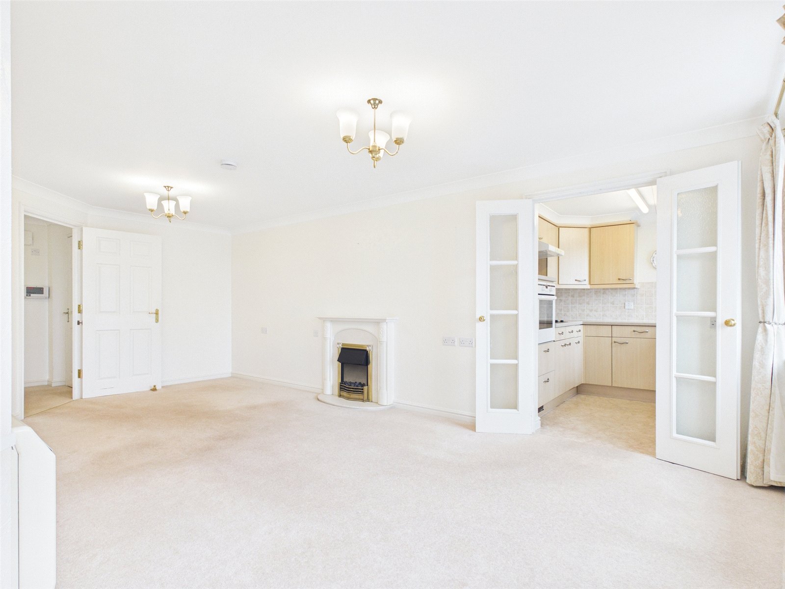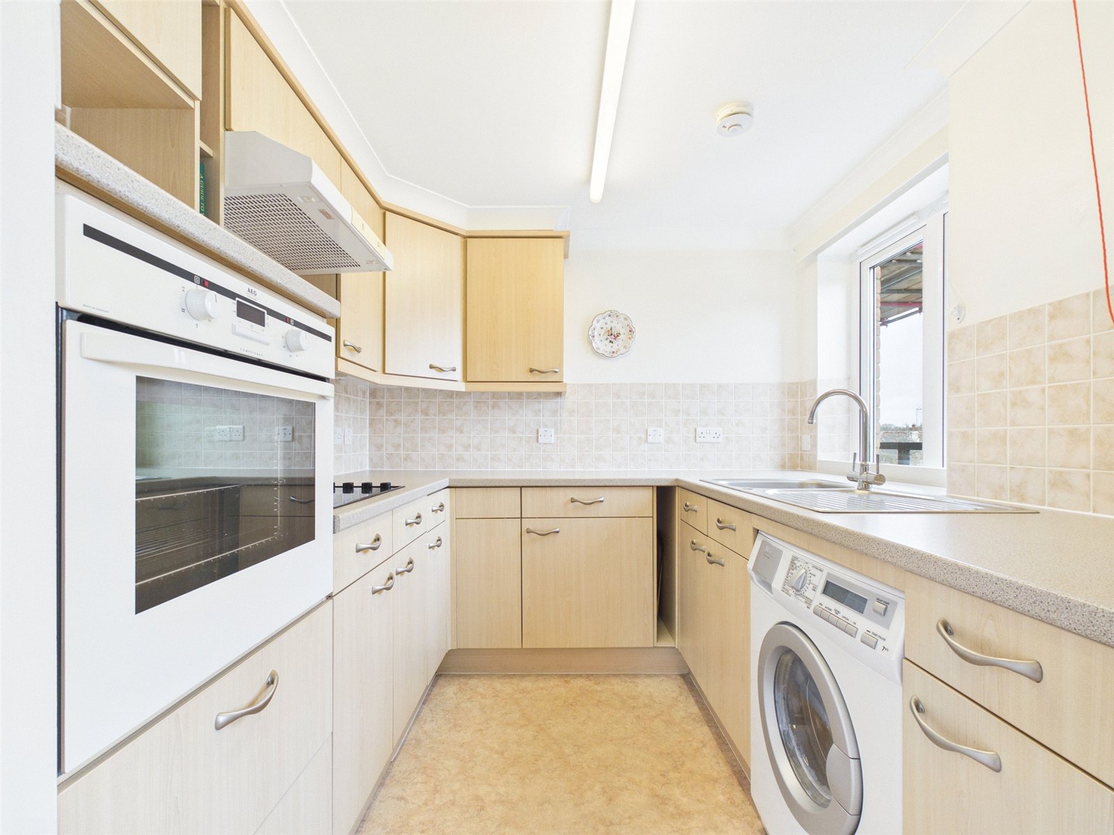 Glass panelled double doors lead in to the kitchen. A window provides lots of natural light. A selection of eye and base level units, cupboards and drawers. Integral eye level oven and hob. Integrated fridge, inset sink and drainer, and space for a washing machine.