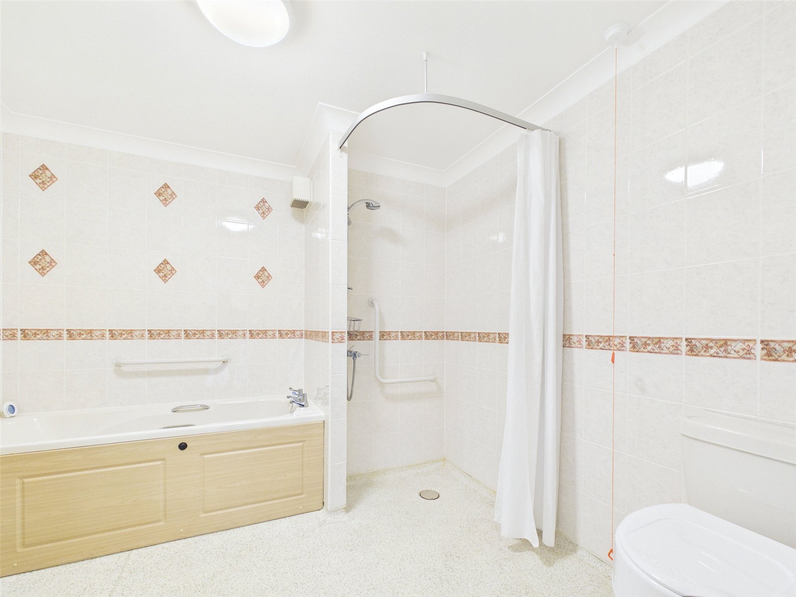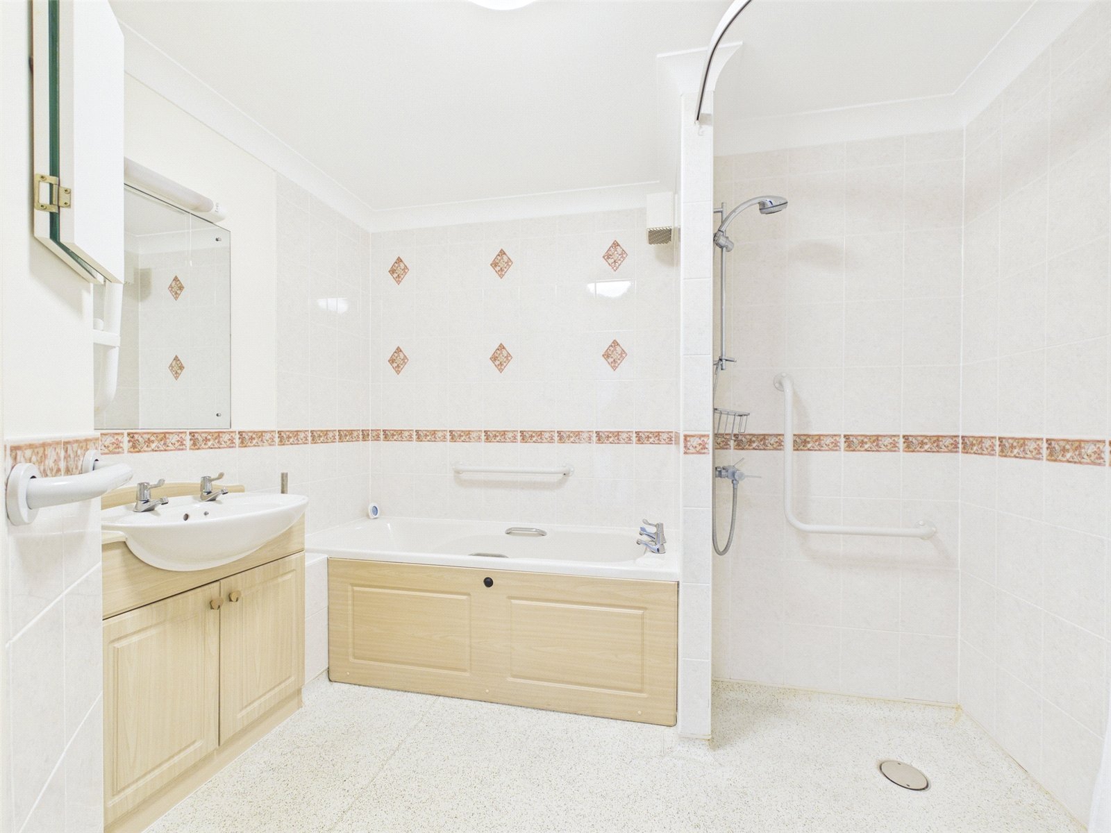 The bath/wet room comprises a panelled bath, shower area, WC, a wash hand basin in vanity unit, has partly tiled walls and heated towel rail.